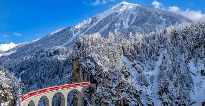 To admire the Swiss snow without the chill, ride the Glacier Express, which runs through the Swiss Alps from Zermatt to St Moritz.